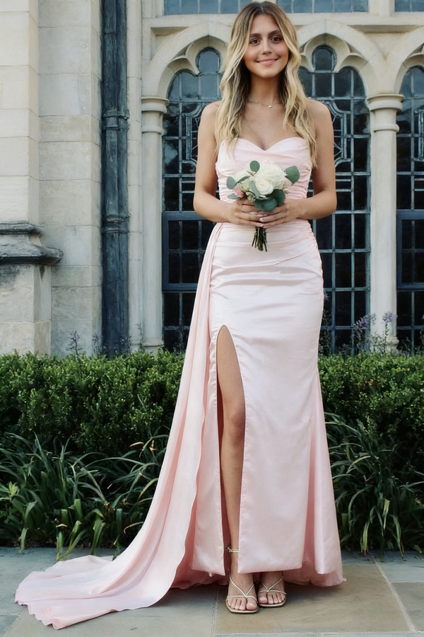 Blush Pink Satin Strapless Prom Dress with Sweep Train and High Slit,