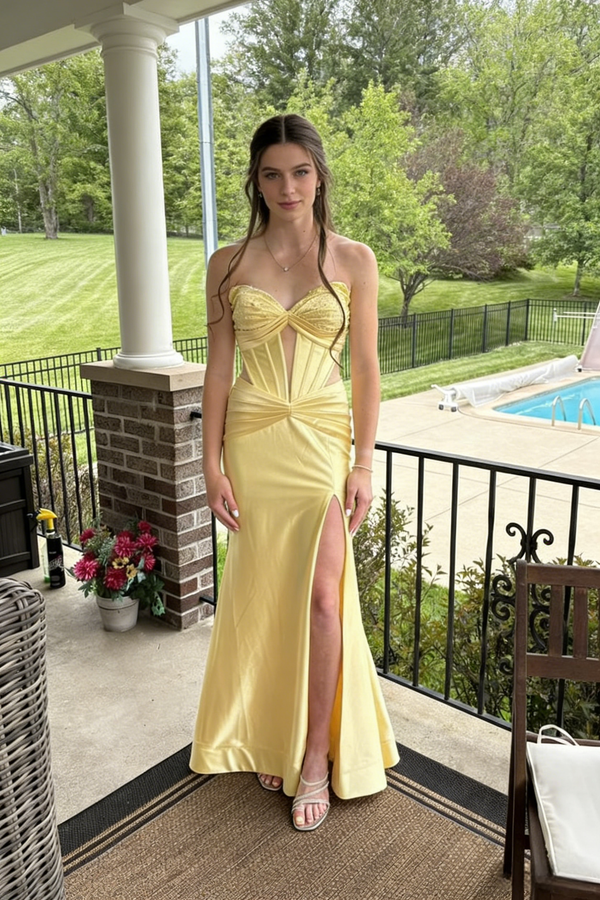Bright Yellow Soft Satin Strapless Corset High Slit Formal Gown | Prom & Party Dress, PD01231