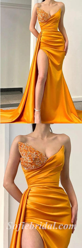 Sexy Satin Sweetheart V-Neck Sleeveless Side Slit Mermaid Long Prom Dresses,SFPD0388