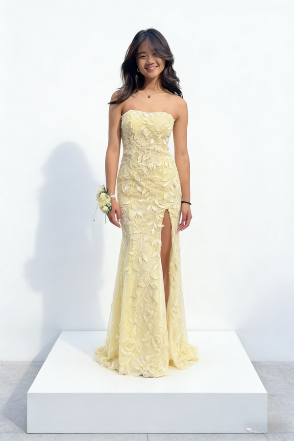 Sexy Yellow Tulle Lace Sweetheart Sleeveless Side Slit Mermaid Maxi Prom Dress/Graduation Dresses, PD01185