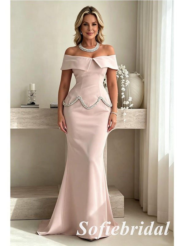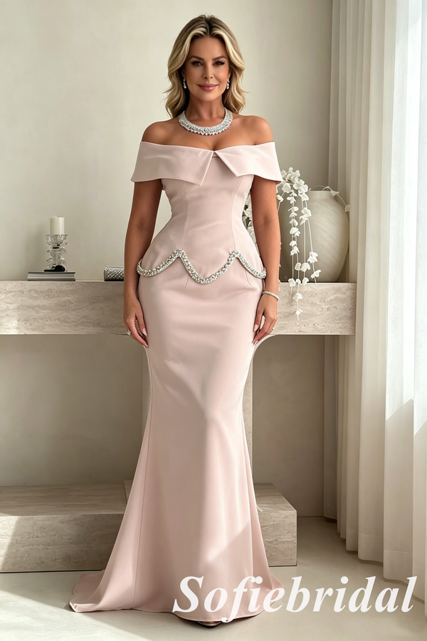 Elegant Blush Pink Off Shoulder Beaded Mermaid Evening Dress, Formal Mother of the Bride Gown, SFM014
