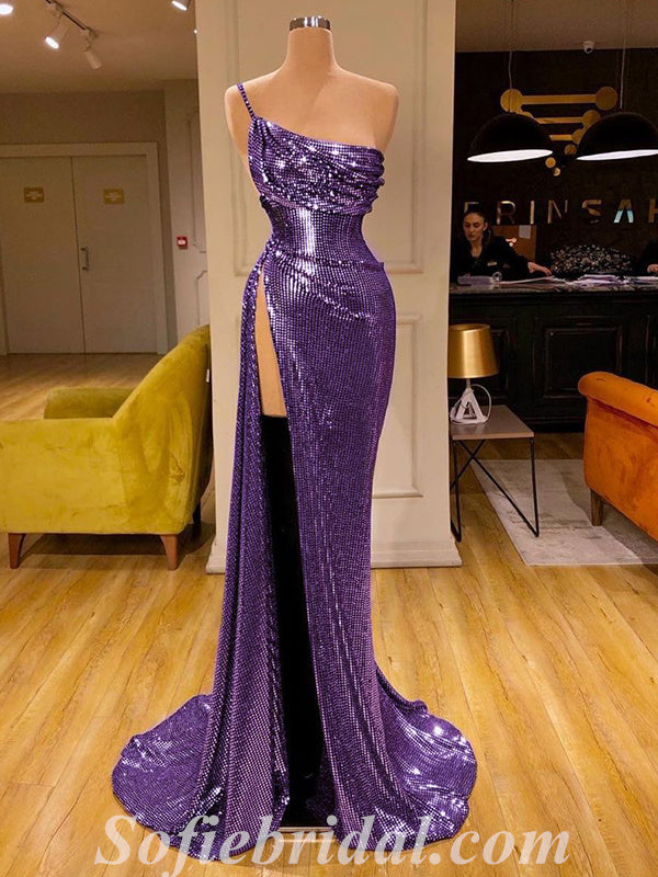 Sexy Purple Special Fabric One shoulder Side Slit Mermaid Long Prom Dresses,SFPD0453
